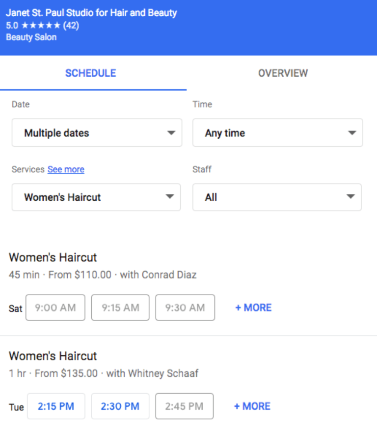 Once you click this local hair salon listing, you’ll see options to choose what type of service and when to schedule it.